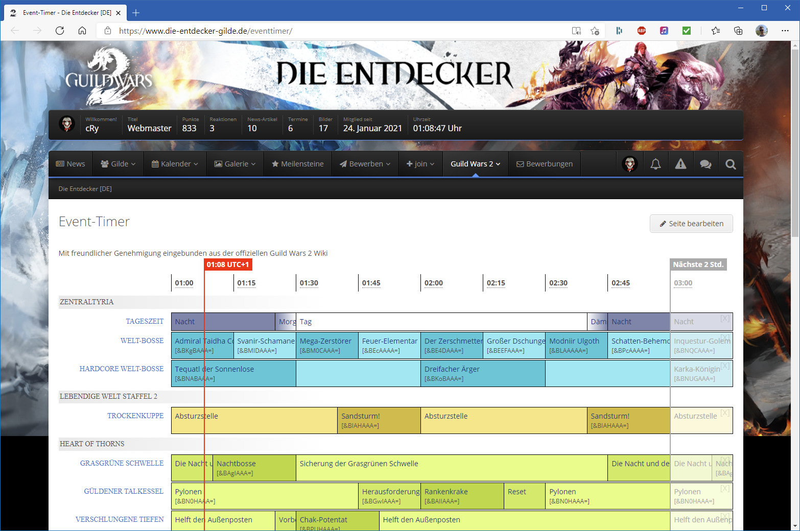 Mit viel Freude können wir euch nun auch den Guild Wars 2 EventTimer direkt hier auf unserer Gilden-Webseite anbieten. Nochmal ein großes Dankeschön an die Betreiber der Guild Wars 2 Wiki!